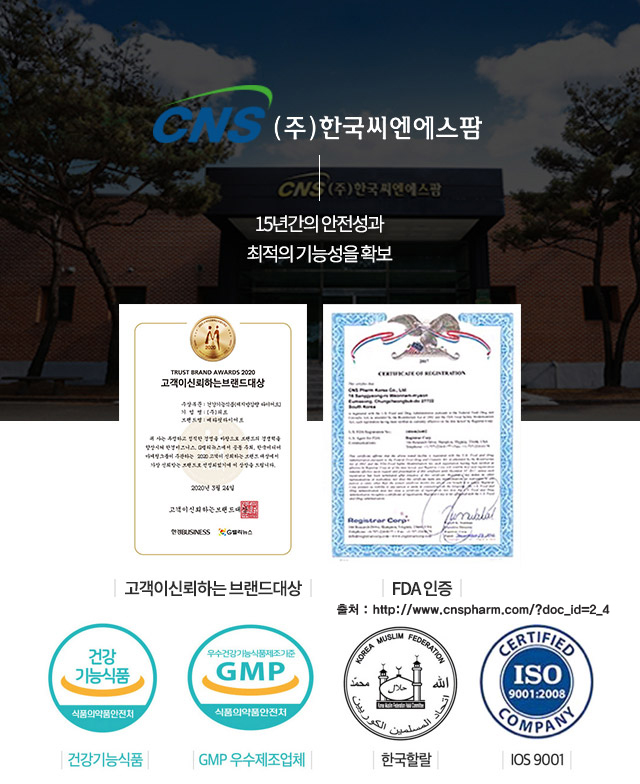 국내 최고 건강기능식품 전문제조업체 한국 씨엔에스팜에서 제조한 이제품은 15년간의 안전성과 최적의 기능성을 확보한 우수한 제품으로 안전성은 물론 품질에 대해서도 높이 평가 되고 있다. 또한 식품영양전문 교수들에게 체지방 감소 효과까지 인정받은 다이어트 방법으로 소비자들의 신뢰를 얻고 있다.